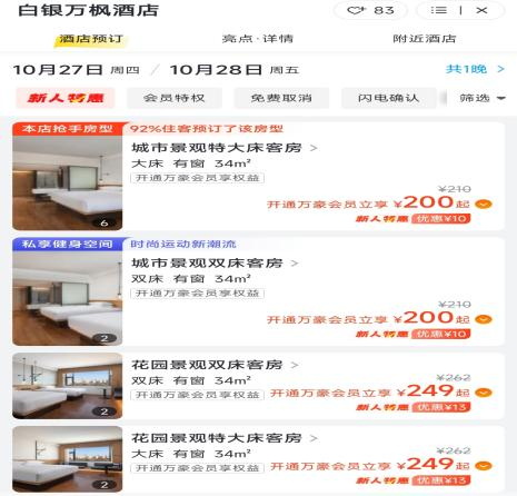 潘哥在飞猪App上,发现甘肃白银市的白银万枫酒店,34平米的城市景观双床客房,会员价仅200元一晚;花园景观双床客房,万豪会员价249元一晚。