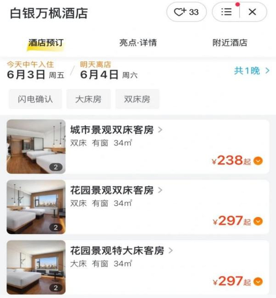 潘哥发现,今年6月初,白银万枫酒店的价格,城市景观双床客房,一晚238元起,如今售价200元,不到半年降了38元;而花园景观双床客房297元起,如今为249元一晚,已经降了48元。
