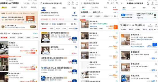 在曲阜鲁能JW万豪酒店,潘哥发现同日期同房型的酒店价格,在飞猪、美团、去哪儿、携程上,分别为541元、570元、566元和569元。