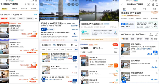 去哪个平台订这些万豪系酒店,能让小伙伴更加省钱呢?以郑州绿地JW万豪酒店为例,潘哥登录飞猪、美团、去哪儿、携程四款App,发现同日期同房型的平台售价,分别为617元、649元、627元和648元。