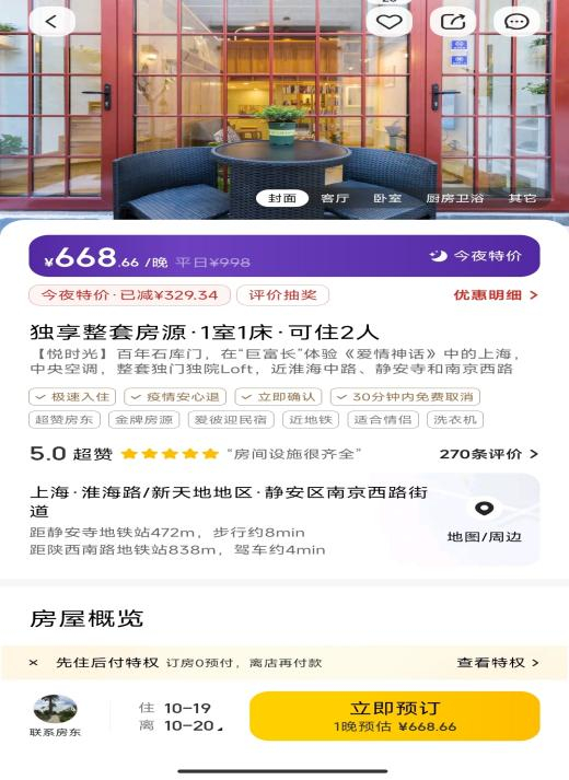 潘哥发现,虽然酒店行业整体低迷,但好的民宿价格依旧坚挺。位于上海静安的一间石库门,一室一床的民宿房间,在美团上售价669元,对比附近的上海静安万枫酒店,一晚389元的价格,贵了280元。