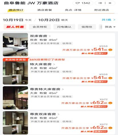 在飞猪、美团、去哪儿上,200元的甘肃白银万枫、239元的郑州上街雅乐轩、617元的郑州绿地JW万豪、541元的曲阜鲁能JW万豪、甚至三四百元的上海万豪系酒店,让潘哥心动不已。