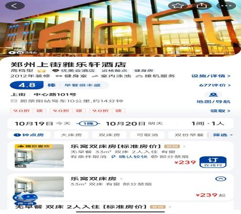 同样在今年6月,有网友在小红书晒图,美团上的郑州上街雅乐轩酒店,最便宜的房间一晚售价466元,对比现在239元的售价,降价接近一半。