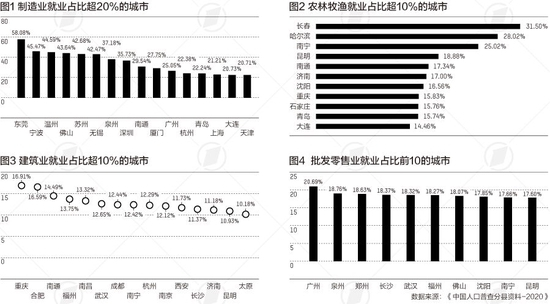 第一财经记者根据《资料》,通过对35个重点城市(包括直辖市、计划单列市、GDP万亿城市、GDP超5000亿的省会城市以及民营经济大市温州)的各行业就业人口占比梳理发现,长春、哈尔滨、南宁等城市的农林牧渔从业人员占比较高;东莞、佛山、宁波、温州、无锡的制造业从业人员占比超过四成;广州的批发零售业从业人员占比超过两成;重庆、合肥的建筑业从业人员占比较高。在收入前三名的信息传输、软件和信息技术服务业、金融业以及科学研究技术服务业的从业人员占比中,北京、上海等城市这一占比较高。