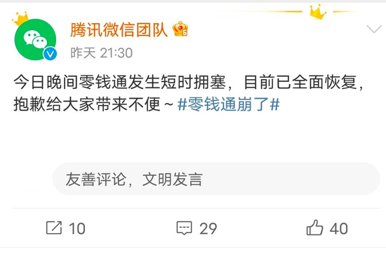 昨夜晚9时30分许,腾讯微信团队发布情况说明: