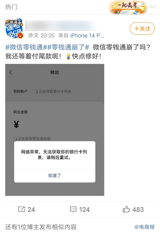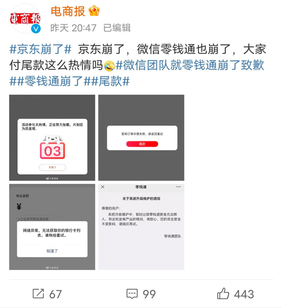 但不少网友反映称,微信“零钱通”出现暂时崩溃的问题,无法顺利支付尾款。
