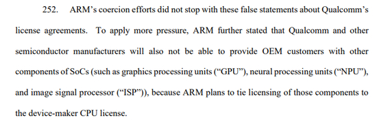 举个例子,如果这条要求成立的话,也就意味着传说中刚刚赶上苹果GPU水平的高通Adreno白研发了,没法用在未来的骁龙芯片上,反而是必须要用 ARM 公版里的 Mali GPU 。