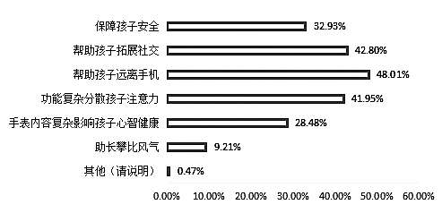 此前,江苏省消保委官方微信公众号发布的“儿童智能手表问卷调查”共获得有效样本6984份。从线上问卷调查结果来看,消费者对于儿童智能手表的评价毁誉参半。大部分消费者比较认可儿童智能手表的保障儿童安全(32.93%)以及帮助孩子拓展社交(42.80%)、远离手机(48.01%)等功能。但同时,功能复杂分散儿童注意力也是家长对儿童智能手表的主要担忧,占比达41.95%;还有28.48%的消费者担心手表内容复杂影响孩子的心智健康,9.21%的消费者担忧儿童智能手表的广泛应用会助长攀比风气。
