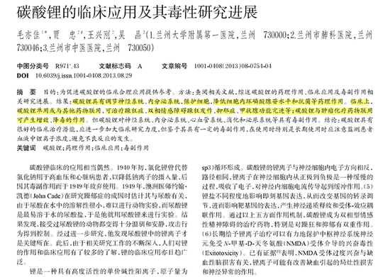 上述文章指出,碳酸锂具有很好的临床治疗潜能,应进一步加大临床研究力度,但鉴于其具有一定的毒副作用,在使用时特别是长期使用时应注意监测患者血液中锂离子浓度。避免不良反应的发生。
