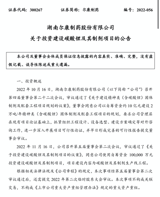 最新公告显示,在论证一个月后,尔康制药作出了正式决定——10亿元投资建设碳酸锂及其制剂项目。
