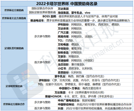 官方信息线上,参与世界杯赞助主要有四大途径,分别为官方赞助、球队签约、足球明星签约、媒体合作。此外,还有卡塔尔球场之外的亚太地区支持者,已合作过多次的三级赞助商BOSS直聘和雅迪电动车。