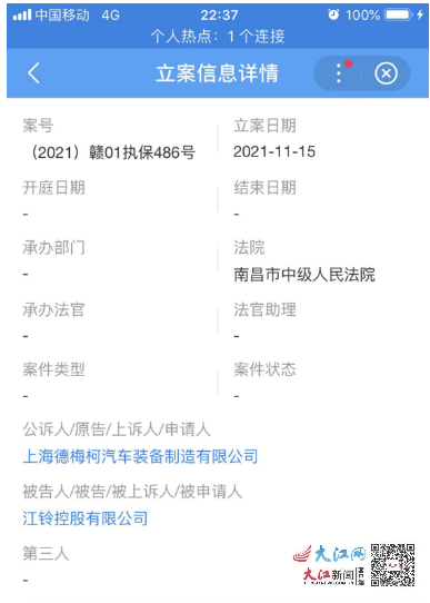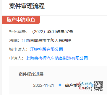 大江网/大江新闻客户端讯 全媒体记者黄思农报道:11月21日,记者注意到天眼查中江铃控股有限公司(后文称“江铃控股”)更新一条立案信息,新增一件破产审查案件,申请人为上海德梅柯汽车装备制造有限公司,经办法院为南昌市中级人民法院。