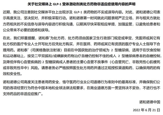 就该药在适用症外使用的问题,今年6月,诺和诺德在中国的管理机构发布了一则声明,强调社交媒体上出现涉及GLP-1类药物的信息为不实与误导内容,“高度关注、坚决反对”。