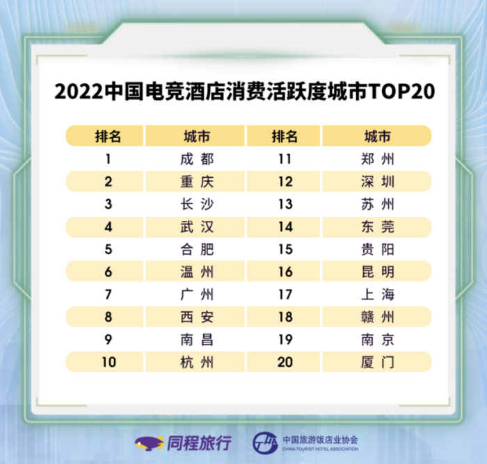 从具体城市来看,成都、重庆、长沙、武汉、合肥、温州、广州、西安、南昌、杭州等地的电竞酒店消费较为活跃。值得注意的是,电竞酒店消费最为活跃的前十个城市中,成都、重庆、长沙、武汉等新一线城市占了7席。