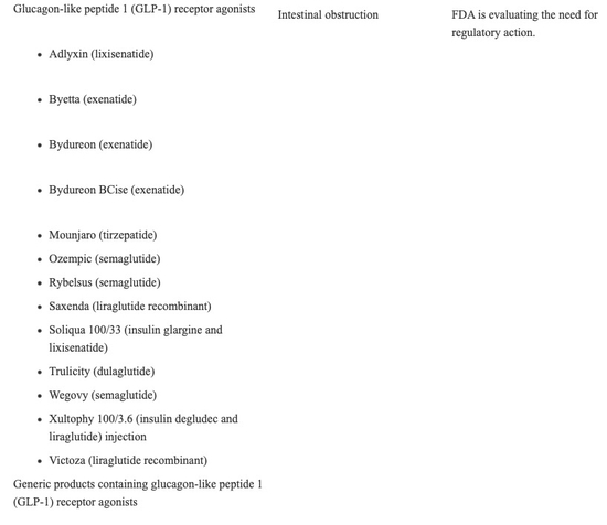 有关司美格鲁肽、利拉鲁肽等GLP-1受体激动剂的药品,被披露有肠梗阻、低血糖、胆囊炎、药物性肝损伤、糖尿病酮症酸中毒等风险(图源:FDA官网)