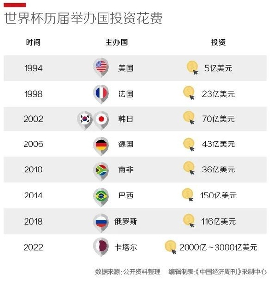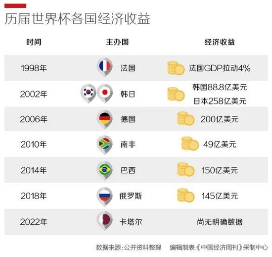 以最近举行的3届世界杯为例。相关资料显示,2010年,南非世界杯为南非带来49亿美元的财政收入及13万个就业机会;2014年巴西世界杯更是创造了高达150亿美元的经济收益;2018年俄罗斯世界杯,除了带来近22万个新增就业岗位外,据俄罗斯官方预测,到2023年俄罗斯国内生产总值有望因世界杯取得1500亿至2100亿卢布的增长。