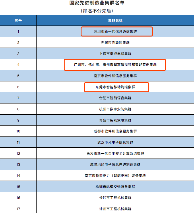 工业大省广东共有7个集群入围,排名全国第二,分别是深圳市新一代信息通信集群,广州市、佛山市、惠州市超高清视频和智能家电集群,东莞市智能移动终端集群,广州市、深圳市、佛山市、东莞市智能装备集群,深圳市先进电池材料集群,深圳市、广州市高端医疗器械集群,佛山市、东莞市泛家居集群。