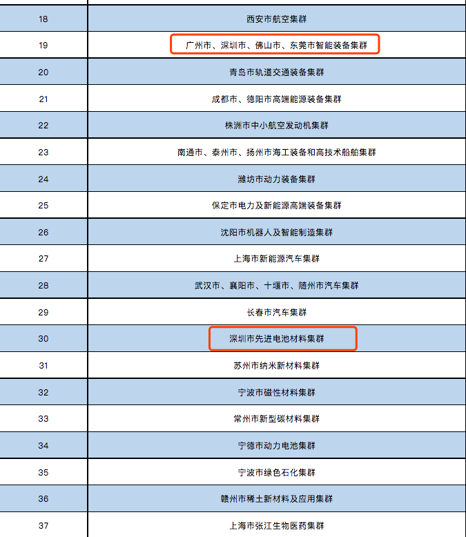 而从单个城市来看,位于珠三角的深圳有4个先进制造业集群被列入名单,拔得头筹。