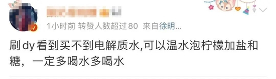 在社交媒体上,有网友发帖称,“前阵子抢菜,现在不光抢药,还抢电解质水、柠檬、梨子”“打开外卖软件,热搜第一名粥,第二名黄桃罐头,第三名电解质水”。还有网友表示,退烧药、电解质水、黄桃罐头都准备好了,现在就等生病了。更有网友开团买电解质饮料。