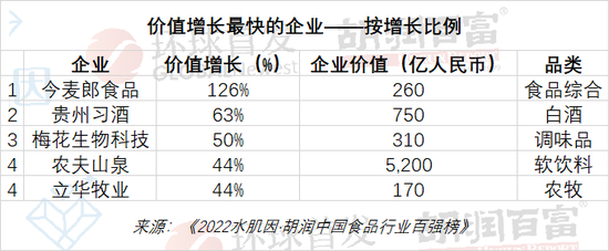 ❖3家企业价值增长超过50%:今麦郎(126%)、贵州习酒(63%)和梅花生物(50%)