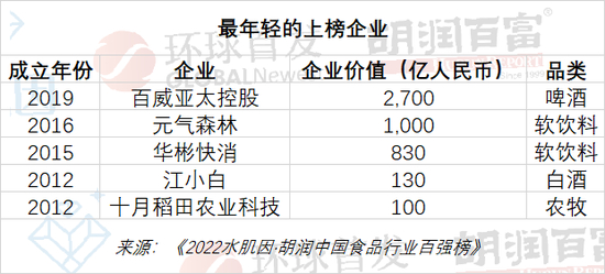 最年轻的上榜企业是2019年成立的百威亚太。最年轻的品牌是2016年成立的元气森林。元气森林价值突破1,000亿元,进入榜单前20名。