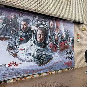 2019年2月20日,上海,南京西路大光明电影院外《流浪地球》的大幅海报。
