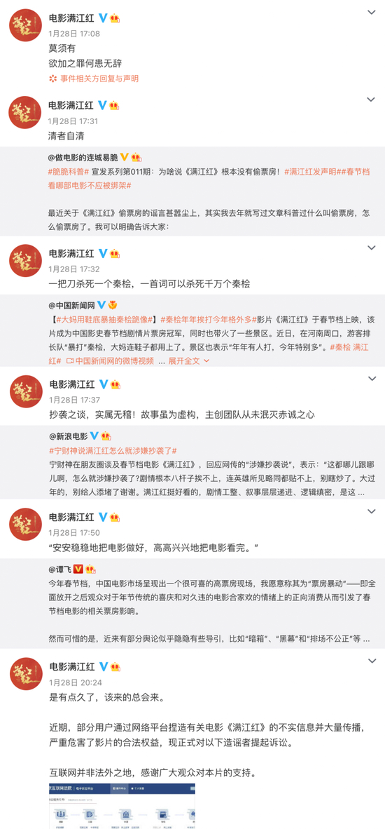 它的戏剧感,戏外比戏里还要明显。1月28日,春节档宣告收官后的第二天下午,《满江红》官方一连发了6条微博来回应此前外界对其“幽灵场”、“偷票房”、“抄袭”、“买票房”和“资本操控”等等质疑。