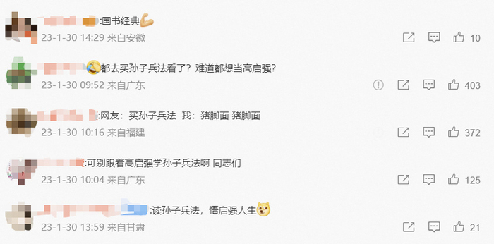 在剧集中,《孙子兵法》第一次出现是在安欣口中,其对当时还是个卖鱼小贩的高启强说,做生意就像打仗一样,要读读《孙子兵法》,此后,高启强一路成长为黑帮老大,一手建立了强盛集团,《孙子兵法》多次出现在家中、办公桌上。而在剧外,《孙子兵法》及其相关书籍也一路登上微信读书飙升榜第一名、淘宝热搜第一名。售卖《孙子兵法》的商家在商品介绍中加上了“启强同款”,甚至有淘宝店铺客服表示,该书卖空,预售需要25天发货。