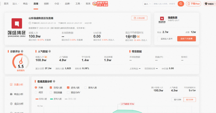 其法定代表人孙红雷,则从事大型酒店、房地产开发、海鲜批发等相关内容。从1月29日的直播来看,直播主要还是围绕在介绍公司上,现实中的强盛集团的确售卖水产品,但以批发为主,此前并不主要面向普通消费者。但是孙红雷也在这场直播中表示,因为观众的热情,后续会考虑在直播间直接上架产品。最终,这场只持续了44分钟的直播,虽然并没有带货,无法产生带货金额,但是观看人次超过100万,累积点赞37万,账号涨粉3923人。