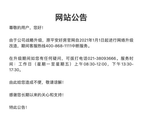 在几年前,平安还推出过平安好房网。据称,平安好房推出新的互联网金融产品“好房贷”,包括首付分期贷款、按揭贷款、过桥贷款、赎楼贷款等,不过该网站已于2021年1月中断服务。