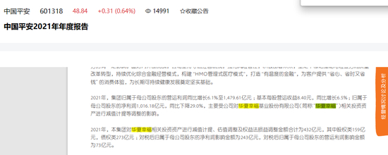 2021年,中国平安对华夏幸福进行资产减值计提合计432亿元,其中股权类159亿元,债权类273亿元,同年,中国平安归属于母公司净利润同比下降29.0%,对净利润影响金额达243亿元。