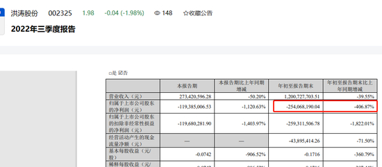 2022年三季度,洪涛股份净利润为-2.54亿元,同比大降406.87%。同期,洪涛股份经营活动产生的现金流量净额为-4389.54万元,同比下降71.50%。