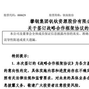 公告表示,各方希望携手提高攀枝花“钒钛之都”钒产业引领能力,建设世界级钒产业基地和钒产业关键技术创新中心,提升攀枝花市钒资源在非钢领域的高效率高附加值利用,推动全钒液流电池产业化、商业化快速发展。