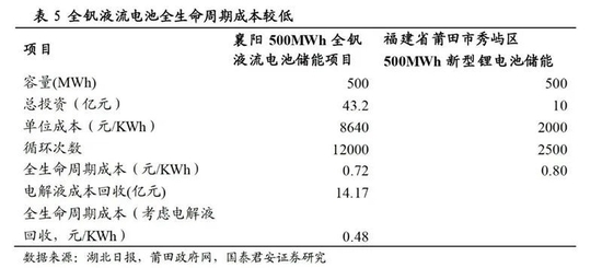 不过,钒电池储能也有其劣势,除了当下技术还不够成熟之外,其初始投入也高于锂电池等技术。国泰君安测算了襄阳500MWh全钒液流电池储能项目与莆田500MWh新型锂电池储能项目的投资回收情况,在容量规模相同的情况下,前者的总投资为43.2亿元,而后者为10亿元。