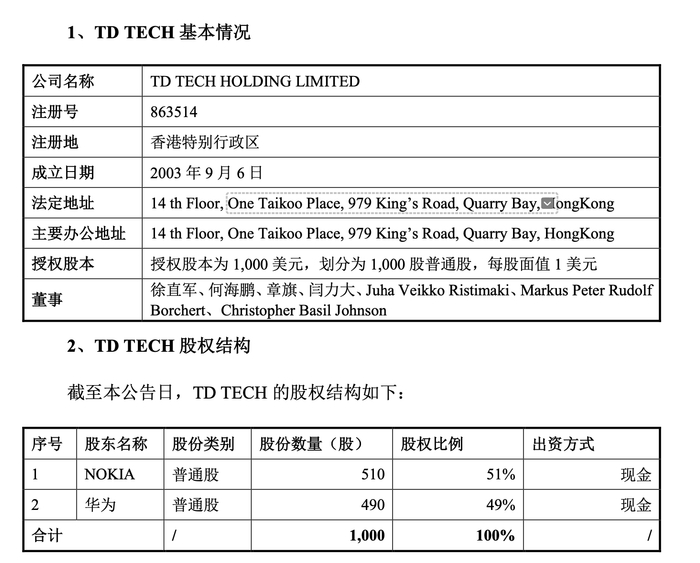 据公告披露信息,TD TECH 公司注册于香港,诺基亚和华为分别持有51%、49%股权,其董事中的徐直军、何海鹏、章旗、闫力大,均为华为高管,其中,徐直军是华为副董事长、轮值董事长。