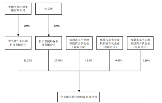 目前,中节能生态持有大地修复55.32%的股权,杭州普捷持有大地修复27.40%的股权,土生堂持有1.88%的股权,土生堃持有9.03%的股权,土生田持有6.36%的股权。