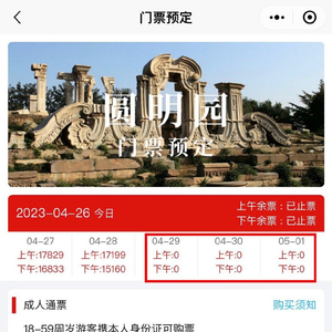 编者登陆北京圆明园预约门票官网入口查询,4月29日至5月2日上午圆明园门票几乎全部售罄。对于圆明园遗址公园来说,果真是难遇之盛况。