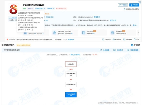 2021年4月,津村曾收购中药饮片企业天津盛实百草中药科技有限公司,花费12亿元。该公司目前注册信息已更名为平安津村药业有限公司。股权穿透后,津村目前持有其44.8%的股权。