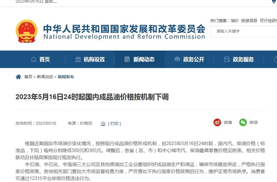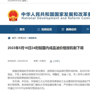 国家发改委表示,根据近期国际市场油价变化情况,按照现行成品油价格形成机制,自2023年5月16日24时起,国内汽、柴油价格(标准品,下同)每吨分别降低380元和365元。