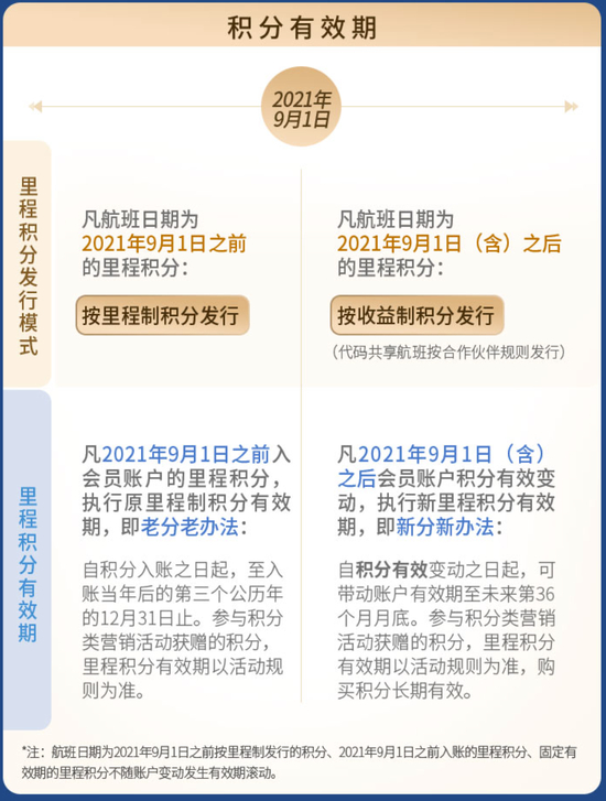不过,东航官网相关的积分新规显示,此规则只针对2021年9月1日(含)之后的里程积分,并用小字号的备注上注明了:航班日期为2021年9月1日之前按里程制发行的积分、2021年9月1日之前入账的里程积分、固定有效期的里程积分不随账户变动发生有效期滚动。