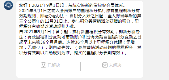 据潮新闻,东方航空在线客服回应称:自2021年9月1日(含)起,东航执行新里程积分有效期,有效里程积分变动可带动账户积分有效期自里程积分变动之日起至未来第36个月月底。连续36个月以上里程积分休眠(无增加,无减少),则自动失效。