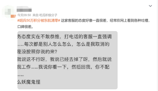 “50万积分突然被东航通知全部清零!对方态度巨差”,知名艺人自述维权失败,航司客服回应