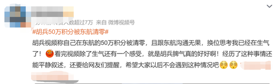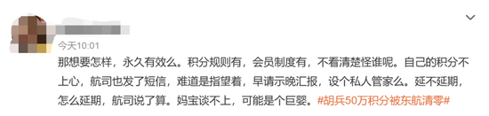 有网友表示,50万积分就这样没了,换位思考也觉得很生气,而胡兵在经历了这种事情还能平静叙述,并给网友们提醒,“希望大家以后不要遇到类似的情况”。也有网友表示,“东航的客服态度一向很差”“如果是一个短信就直接50w积分一起清零真的不太合理吧”……
