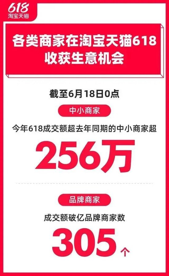 淘天的战报显示,截至6月18日0点,超256万名中小商家今年618的成交额超过去年同期。还有118万名中小商家达成了“1万元成交”的小突破,其中6.8万名商家加入淘宝还不到3个月。