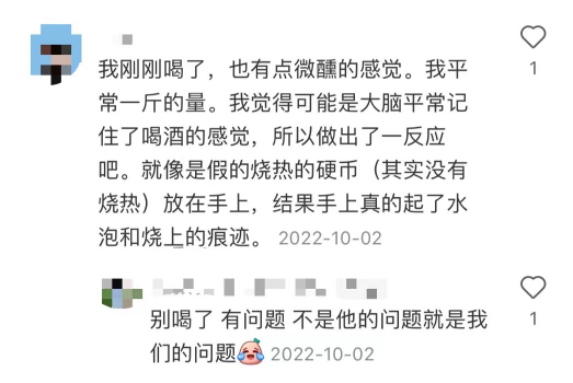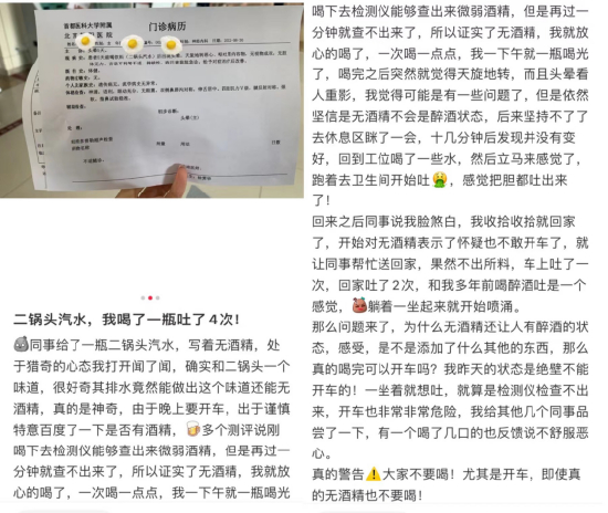 此外,很多人称二锅头汽水虽然无酒精,但仍能让人感到醉意。甚至有人在小红书上表示,自己喝了二锅头汽水后,喝完感觉天旋地转,随后多次呕吐,甚至因此而去了医院。底下有不少网友表示,自己也有过类似的感受,称自己喝完后头晕恶心,有微醺的感觉。
