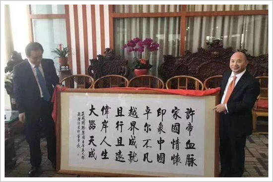 这次会面,王文银送给许家印一幅字:“许帝血脉,家国情怀,印象中国,卓尔不凡,越界成就,且行且远,伟岸人生,大器天成。”同时也是一首藏头诗:许家印卓越且伟大。