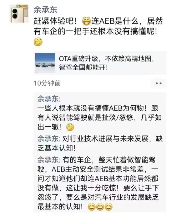 余承东3日晚间表示:“一些人根本就没有搞懂AEB为何物!跟有人说智能驾驶就是忽悠,几乎如出一辙!对行业技术进展与未来发展,缺乏基本认知!”