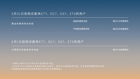 - 今年 4 月,蔚来对新购车用户换电权益调整,家充桩从免费改为付费,每月免费换电次数改为 4 次;