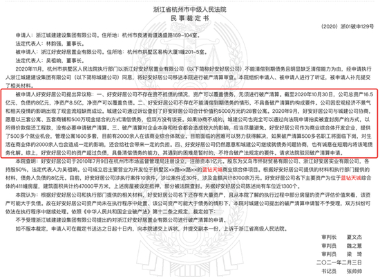 浙江省杭州市中级人民法院认定,好安好居公司名下还存有大量资产,且从了解的执行过程中部分房屋的资产评估价值来看,该资产可能大于负债,因此不予受理浙江城建提出的对好安好居公司进行破产清算的申请。