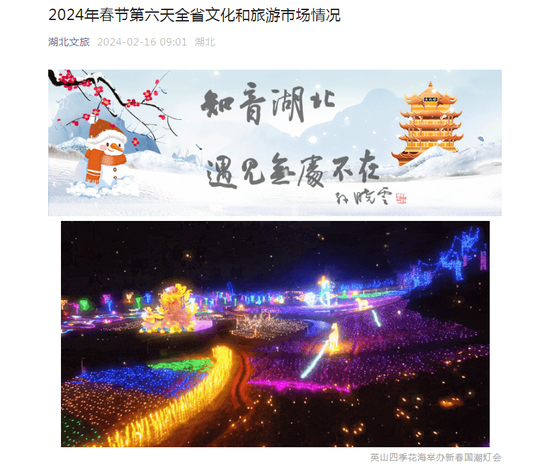 2月15日,湖北文旅发布消息称,截至2月15日,全省A级旅游景区共接待游客1184.47万人次,较2023年、2019年同比分别增长55.36%、94.23%,星级饭店平均出租率为61.97%(出租客房数/可出租客房数),较2023年、2019年星级饭店平均出租率同比分别增长9.48个、6.98个百分点。